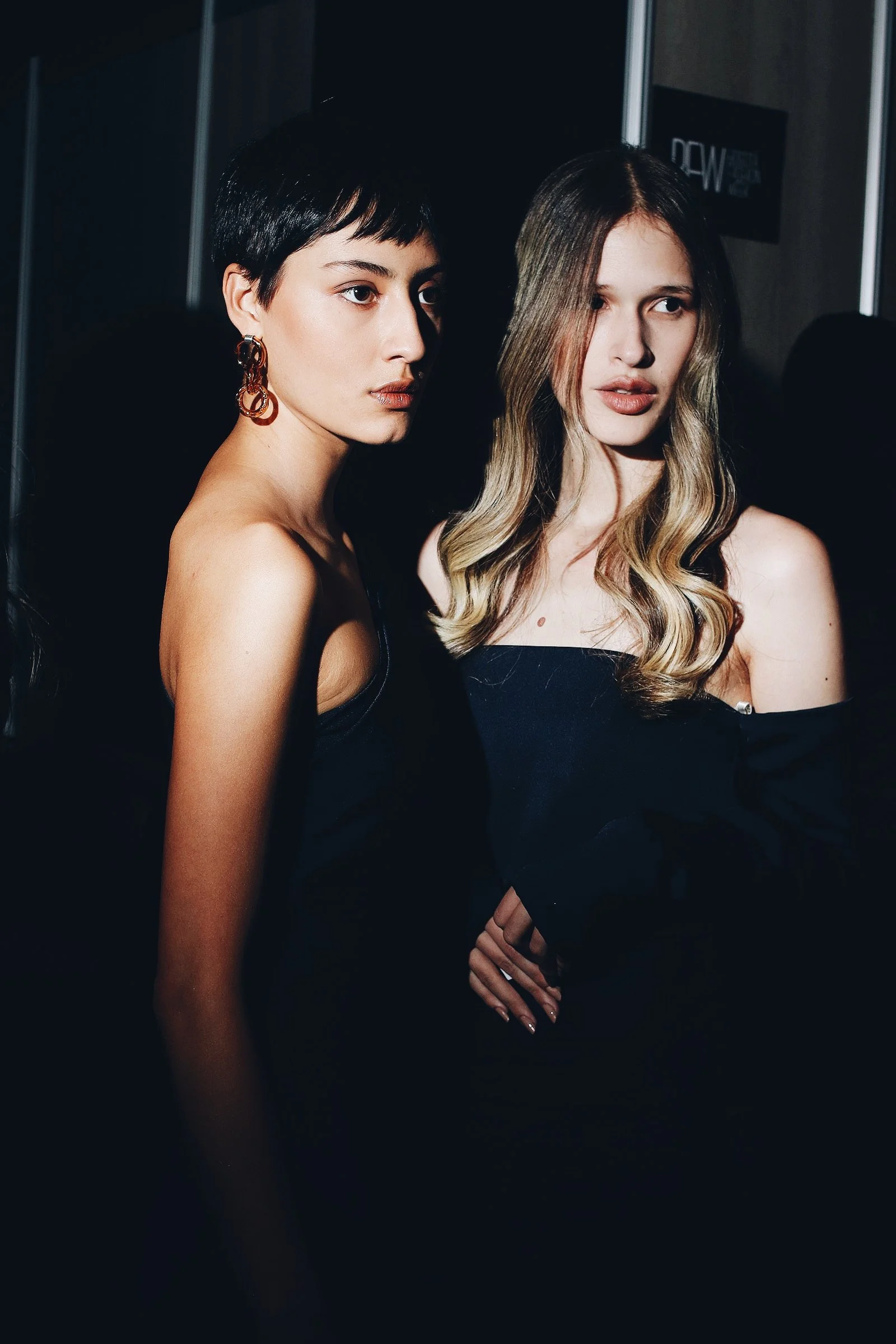 Dos mujeres en un evento, una con cabello corto y oscuro, y otra con cabello largo y rubio, vestidas de negro.