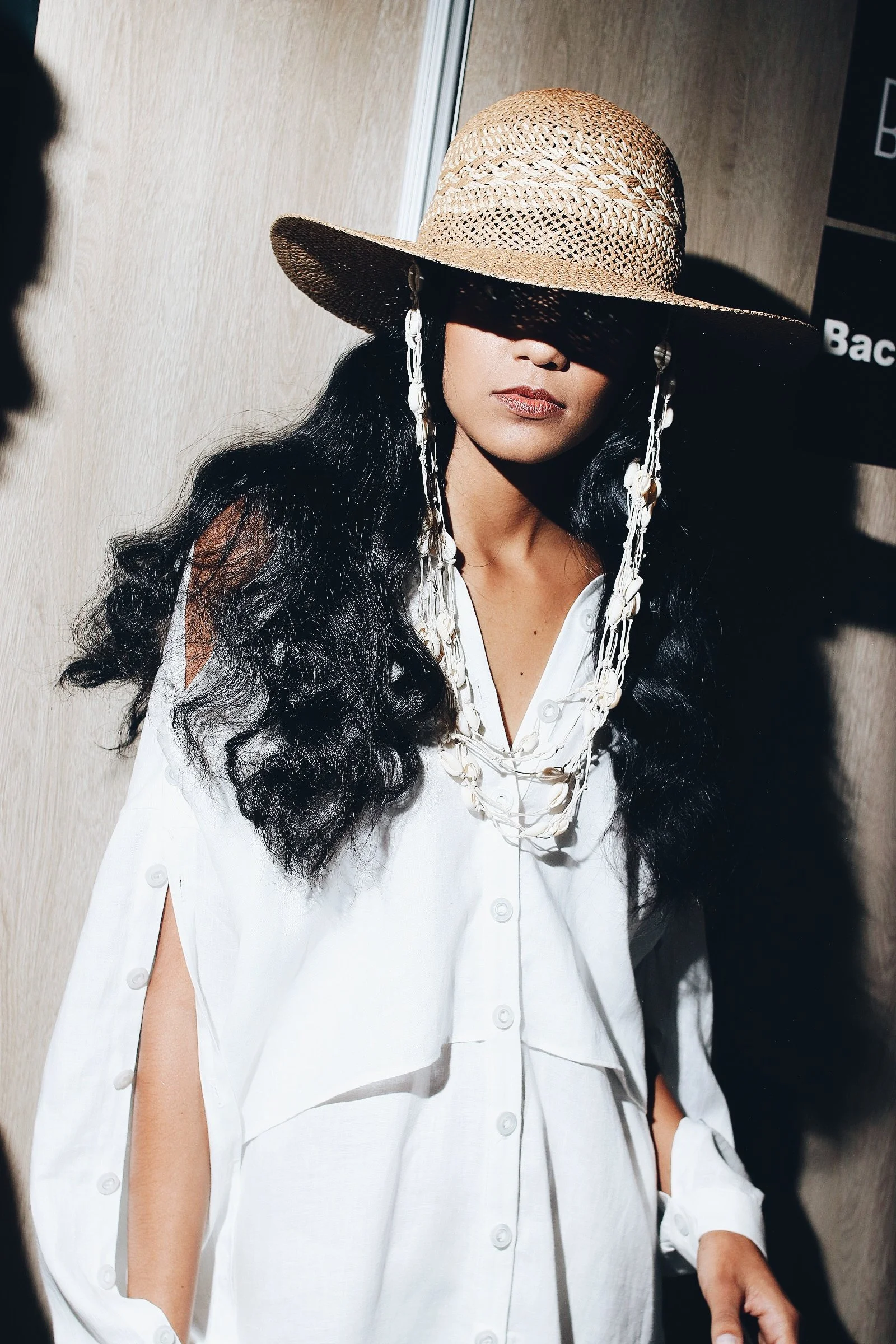 Mujer con cabello rizado largo, vestido blanco con mangas abiertas, sombrero de paja grande con cadenas de conchas blancas, posando en un fondo de pared de madera