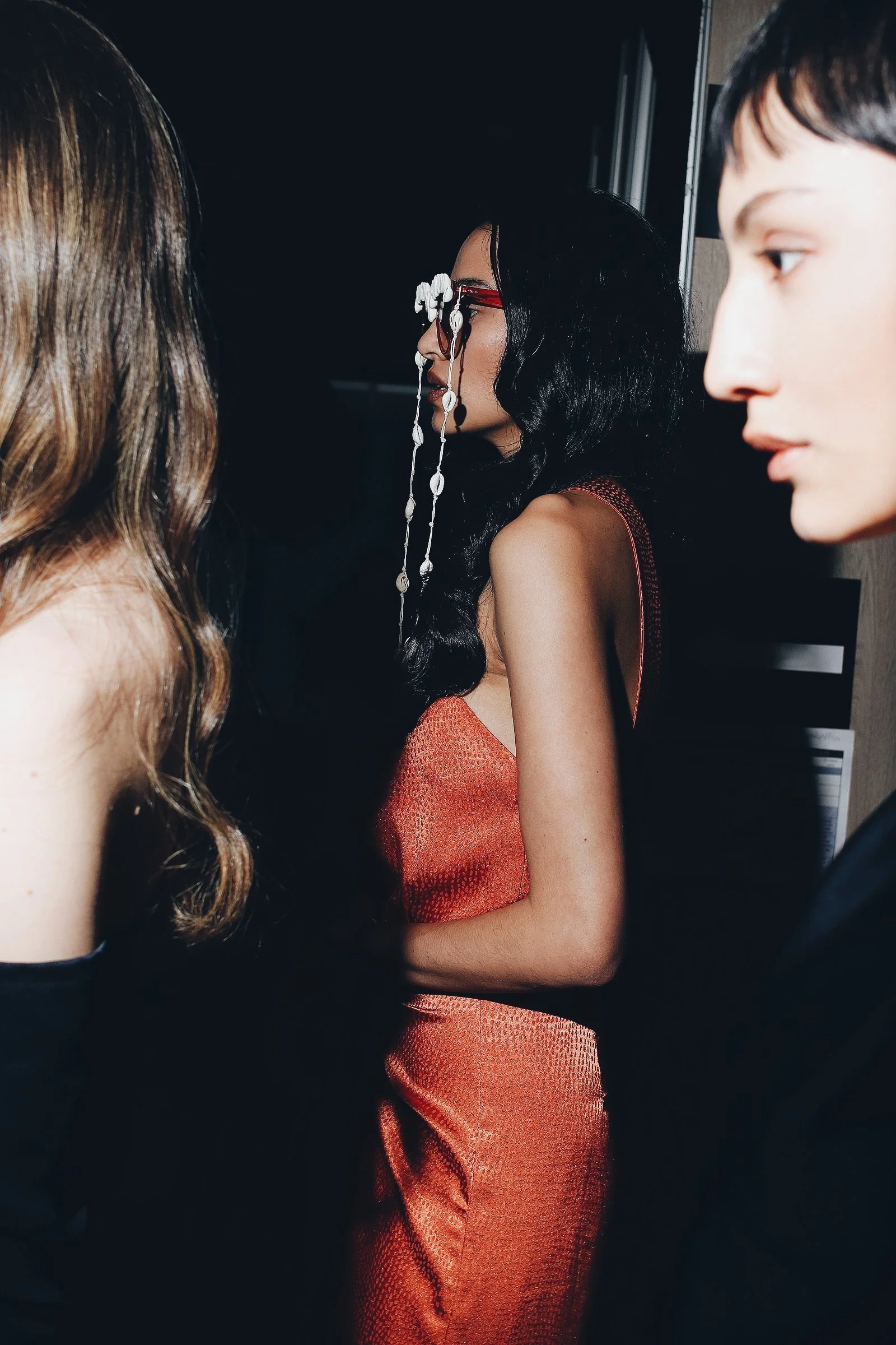 Tres personas en un espacio oscuro, una mujer en el centro con vestido naranja y accesorios en el rostro, y dos personas a los lados parcialmente visibles