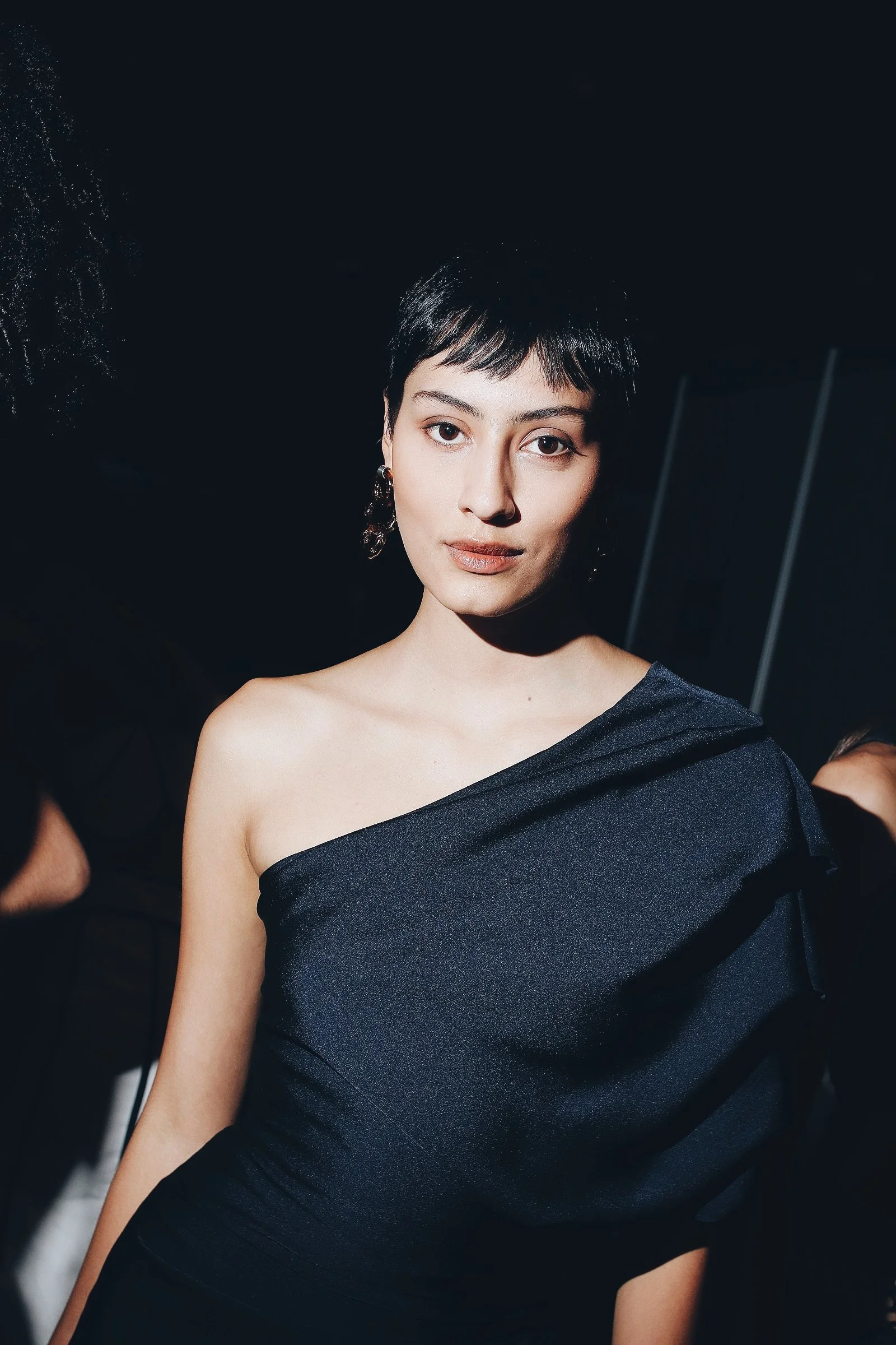 Una mujer con cabello corto y oscuro, vestido negro y pendientes, posando en un fondo oscuro.