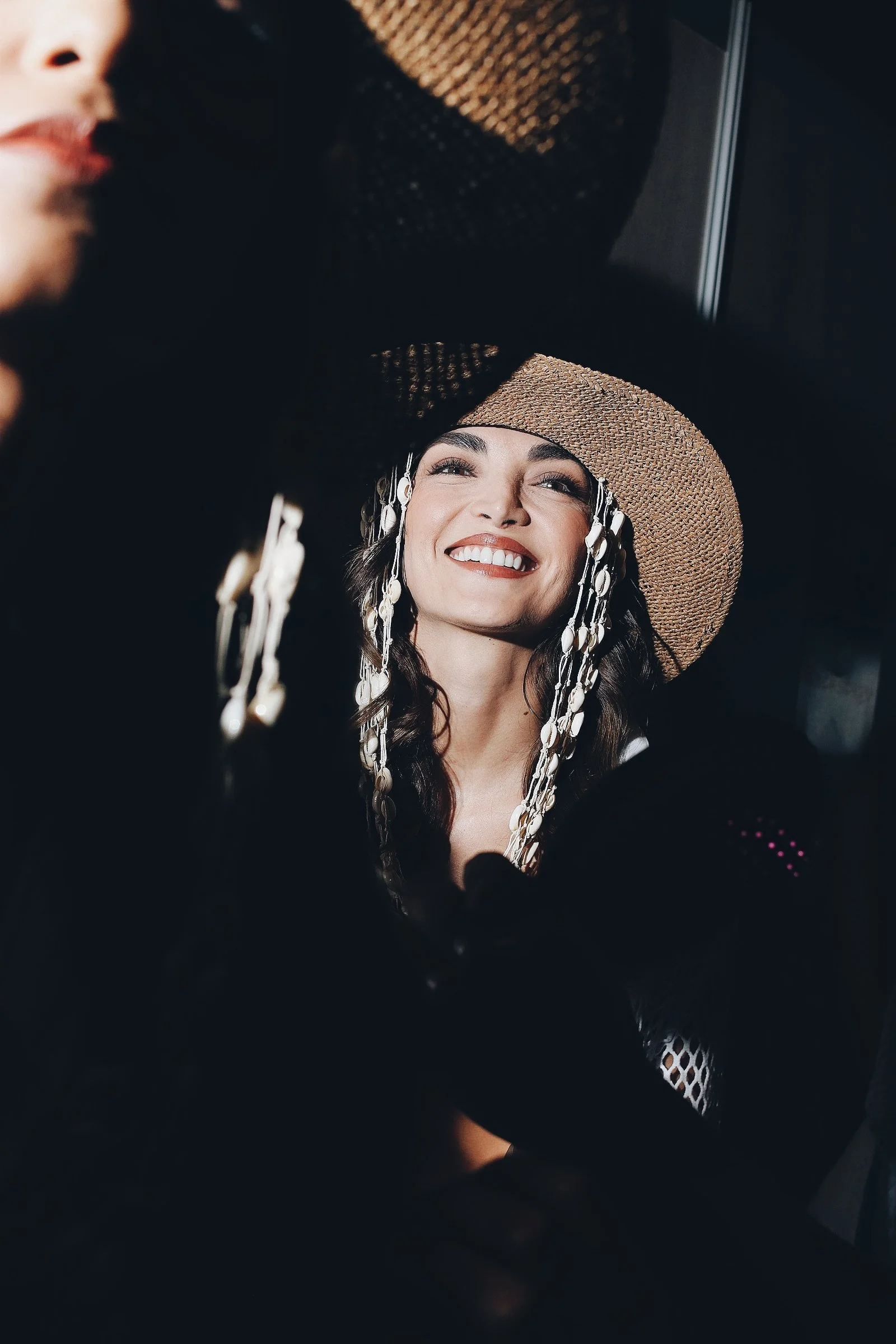 Mujer sonriendo con sombrero de paja y adornos de conchas, reflejada en un espejo oscuro.