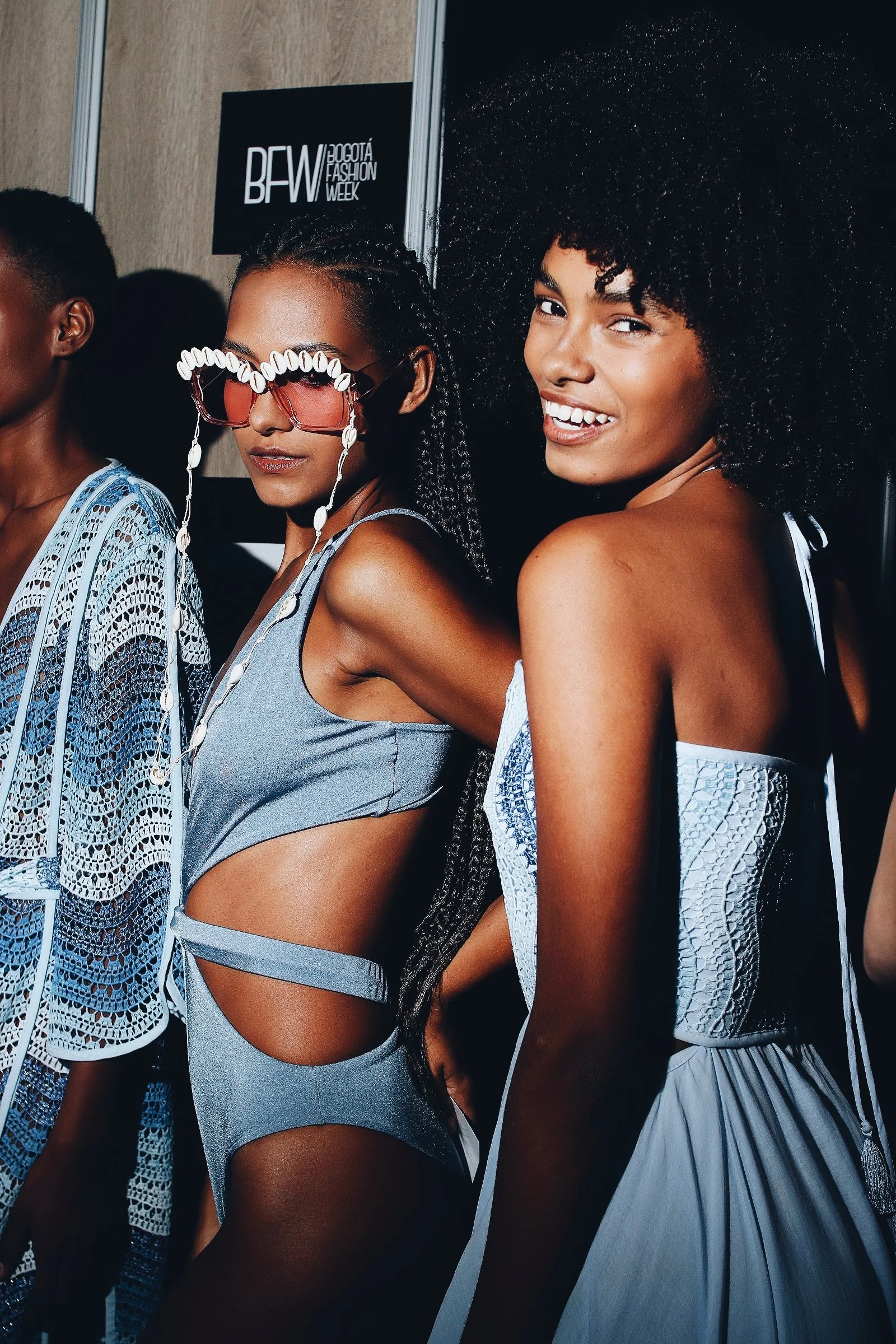 Modelos en backstage en un desfile de moda en la Semana de la Moda de Bogotá, con ropa de estilo veraniego y accesorios como gafas de sol y sombreros.